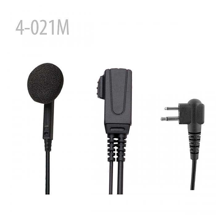 The earphone connects to the PTT switch in which the microphone is hidden. The second wire extends from the PTT switch to the plug that connects to the two-way radio headphone jack.